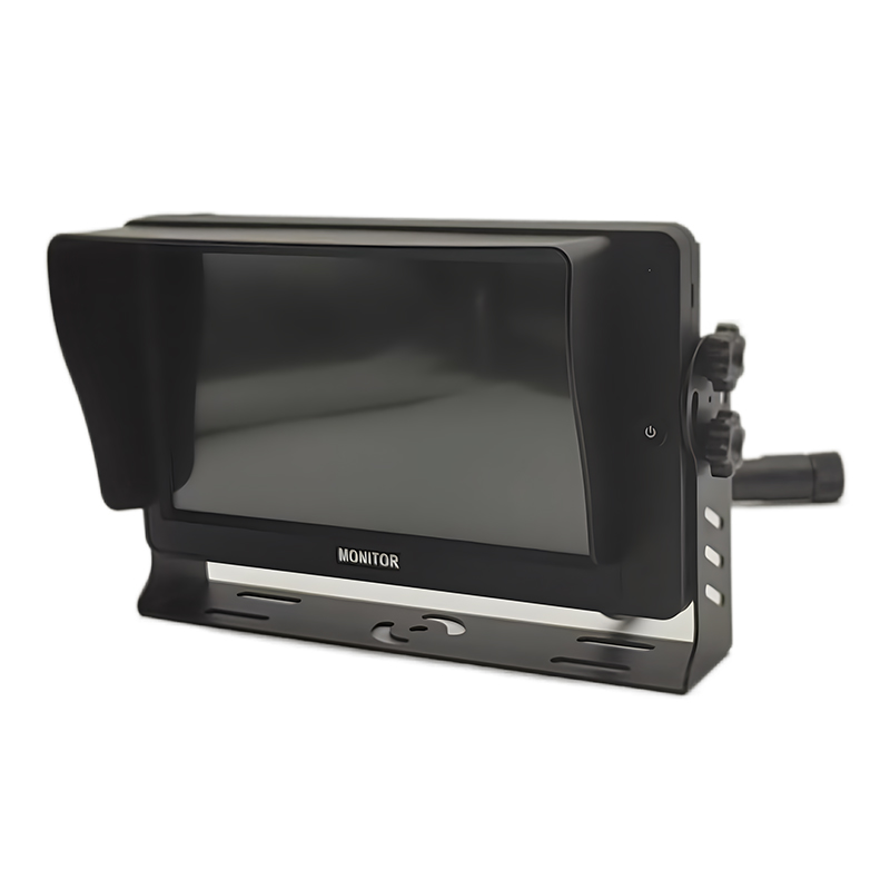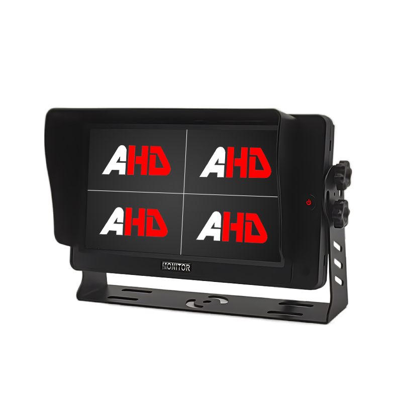 Carleader 7 Inch High Brightness AHD Quad View Heavy Duty Vehicle Bus Truck Monitor, a high-definition AHD monitor featuring a 7inch touch screen display. It supports multiple video inputs, allowing users to view up to four cameras simultaneously. The monitor can be used for a variety of applications including security, surveillance.