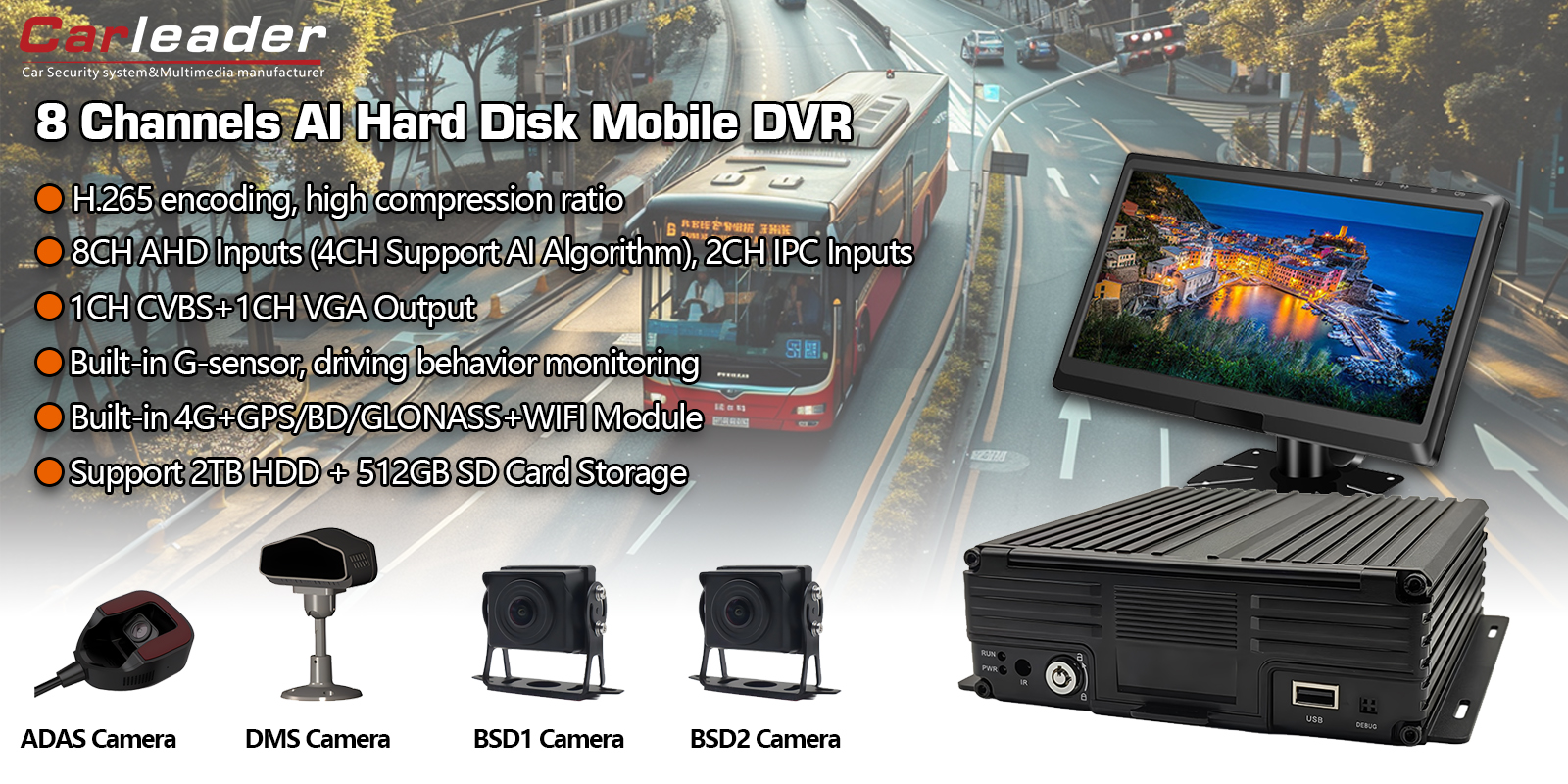 Carleader 8CH AI HDD Mobile DVR Support ADAS+DMS+BSD is the perfect solution for commercial fleets, public transportation, logistics, and special vehicles requiring: