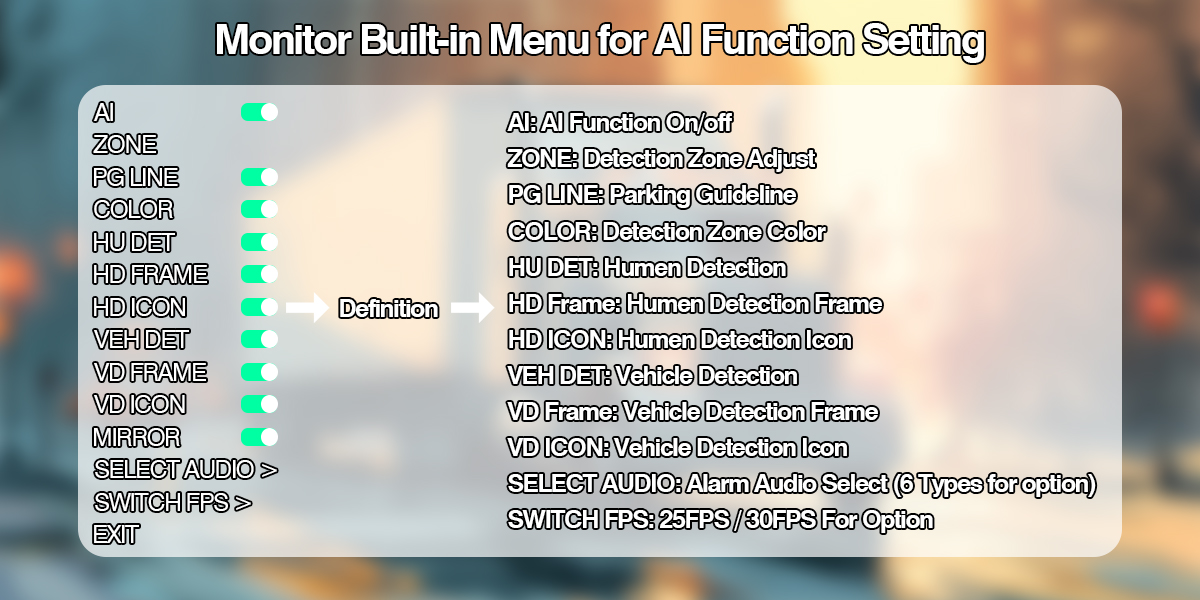 Carleader 7 Inch AI BSD Blind Spot Detection Monitoring System Support AI Calibration, a AI camera solution which support pedestrian detection, vehicle detection, significantly increase safety while driving, monitor with built-in AI calibration menu, allow user to adjust the detection area, detection zone color display on/off, alarm audio type, vehicle and pedestrian icon display, detection object selection, etc.