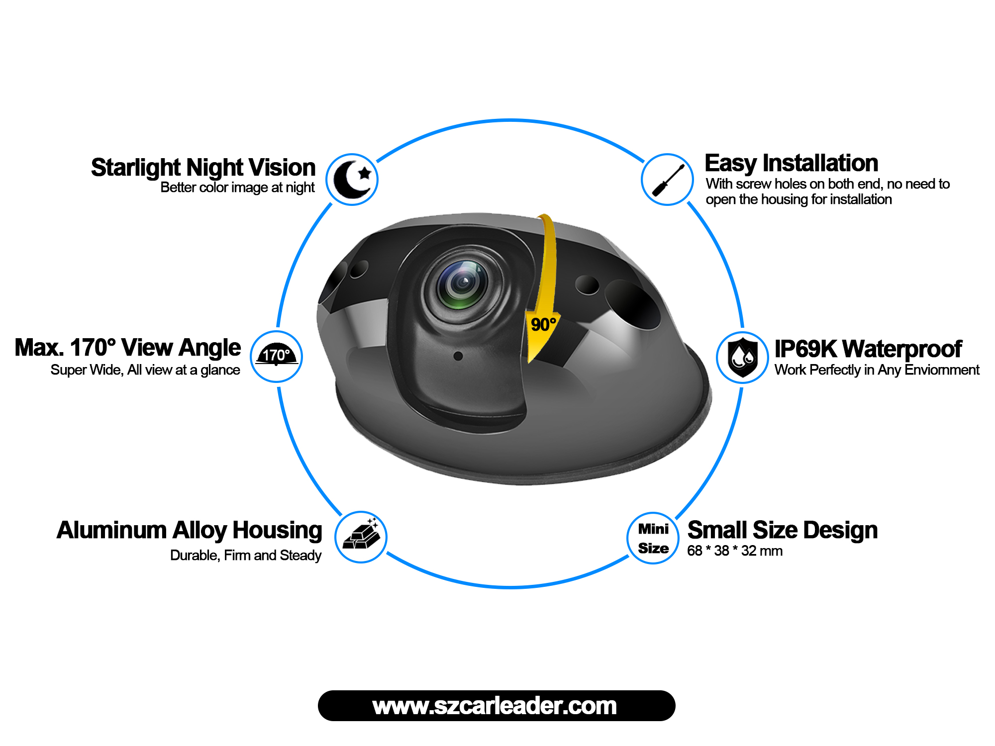 In the vehicle field, Carleader AHD 170 Degree Wide View Angle Waterproof Heavy Duty Backup Camera are widely used in trucks, buses, school buses, RV engineering equipment and other heavy vehicles. It can be used as a front, side and rear view camera, and can even be combined with MDVR to achieve video recording, remote monitoring, fleet management and other functions