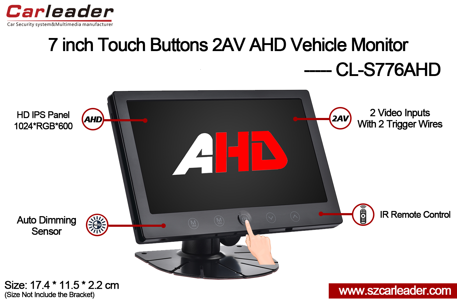 Carleader 7 Inch IPS Screen 2CH AHD Input Touch Buttons Heavy Vehicle Monitor is a high-performance 7-inch AHD monitor designed for reliable and clear visual display in various applications. Featuring an advanced auto-dimming function, it ensures optimal screen visibility under different lighting conditions, reducing eye strain and enhancing usability.