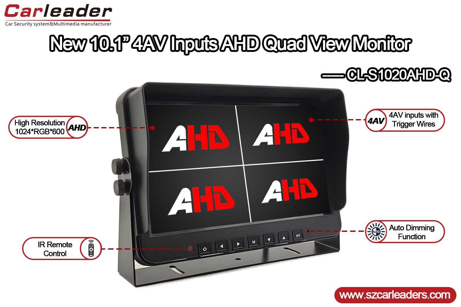 Ideal for vehicle, security, and industrial monitoring applications, Carleader 10.1 Inch 4CH Quad Display Heavy Duty Vehicle AHD Monitor combines robust functionality, clear display quality, and user-configurable options in a compact and durable package.