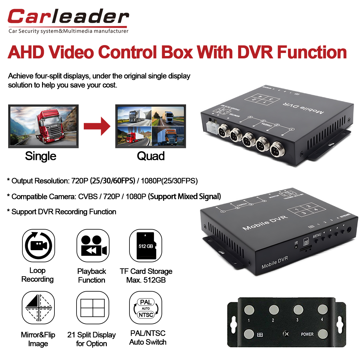 Elevate vehicle surveillance system with Carleader 1080P AHD Quad Split Display Video Processor Support Video Recording, a versatile 4CH video splitter box integrated with advanced DVR recording capabilities. Designed for reliable, flexible, and high-definition monitoring, this compact unit ideal for fleet management, security vehicles, or any application requiring multi-camera inputs recording and display system.