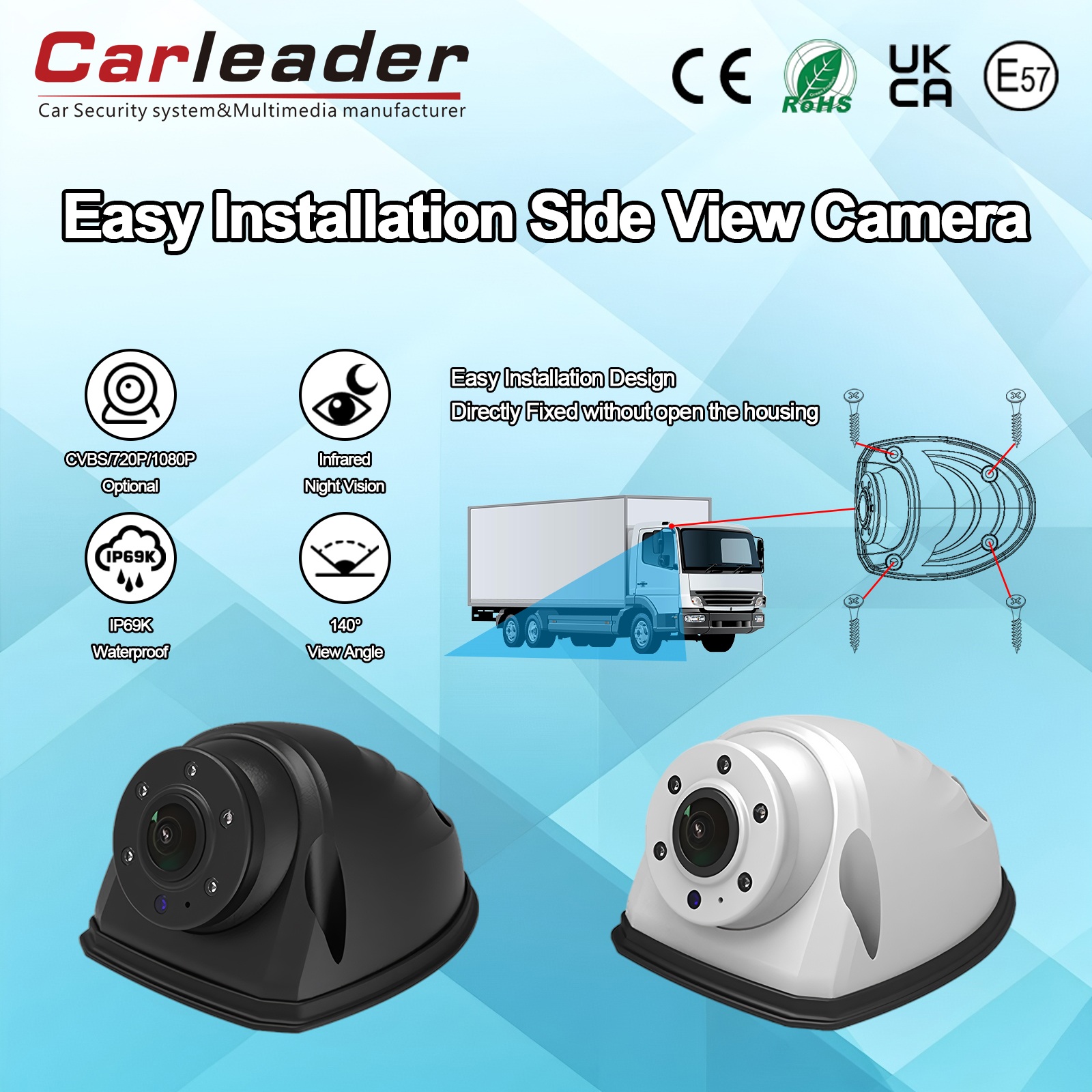 Carleader AHD Quick Installation Heavy Duty Side View Camera White is a high-performance side view AHD camera designed to deliver clear visibility in any harsh weather conditions. Mainly Designed for its multifunctional and durable performance, this compact camera system is suitable for commercial vehicles, industrial equipment, and security applications where clear peripheral vision is needed.